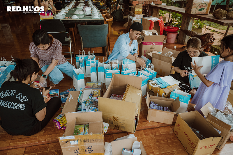 Early in the morning, SHIN Coffee and Red Communications volunteers prepared gift sets including notebooks, school supplies, mooncakes, and lanterns for the children to enjoy the Mid-Autumn celebration.